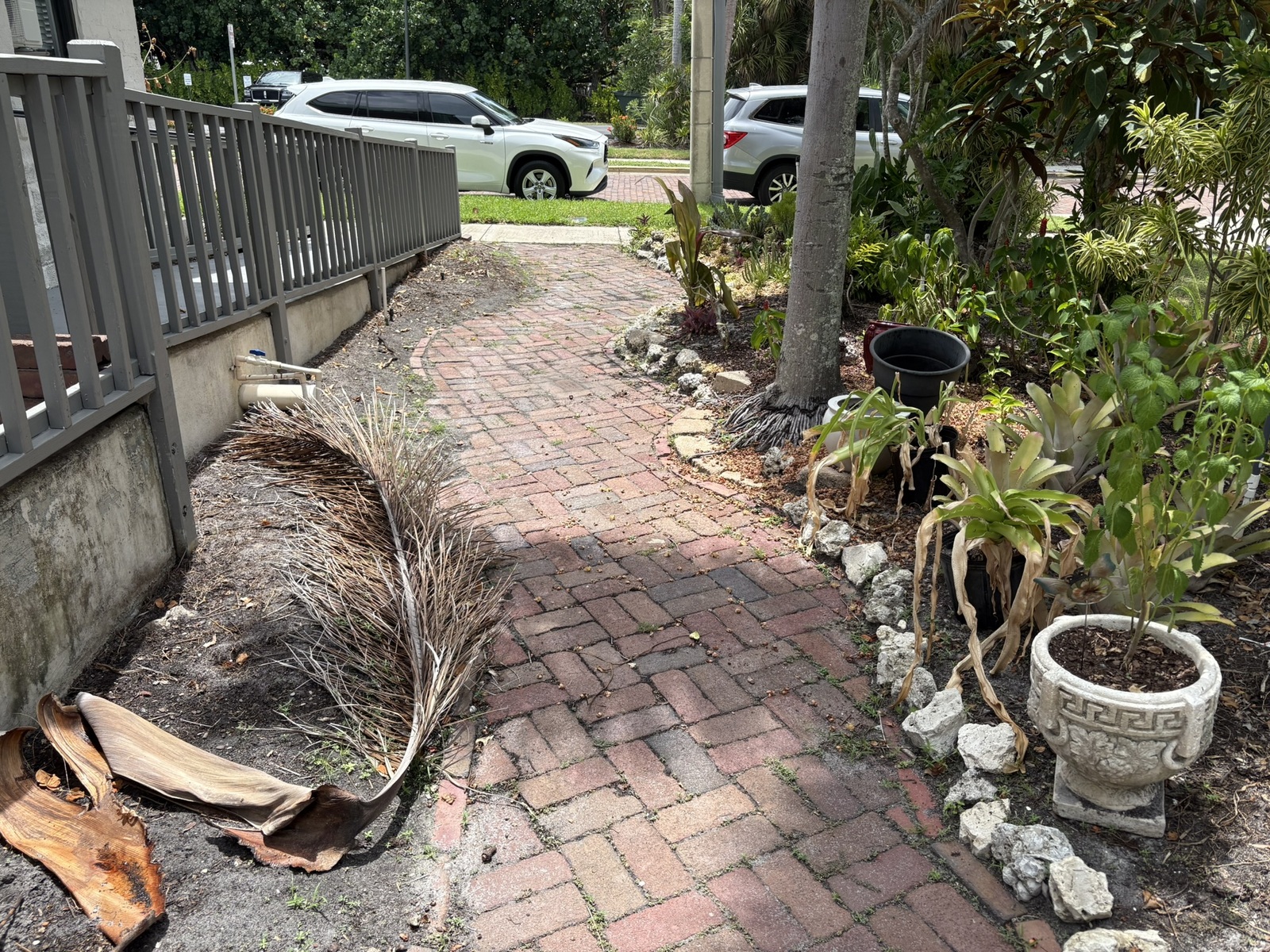 While garden volunteers managed to save some smaller plants by carefully transplanting them into containers, the majority of mature shrubs and trees—including several rare and unique specimens—were either severely damaged or destroyed. The building's entire perimeter now sits barren, showing only dirt and remaining stumps.